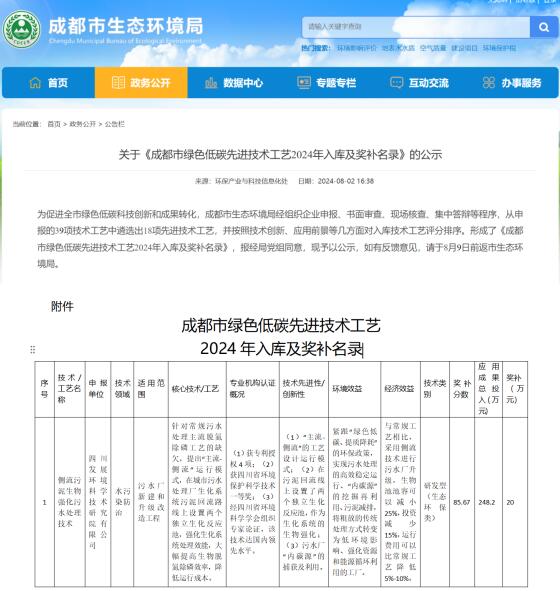 近日,成都市生態(tài)環(huán)境局印發(fā)了關(guān)于《成都市綠色低碳先進(jìn)技術(shù)工藝2024年入庫(kù)及獎(jiǎng)補(bǔ)名錄》的公示,經(jīng)組織企業(yè)申報(bào)、書面審查、現(xiàn)場(chǎng)核查、集中答辯等程序,并按照技術(shù)創(chuàng)新、應(yīng)用前景等幾方面對(duì)入庫(kù)技術(shù)工藝評(píng)分排序,我公司側(cè)流污泥生物強(qiáng)化污水處理技術(shù)成功入選成都市綠色低碳先進(jìn)技術(shù)工藝,并獲20萬(wàn)經(jīng)費(fèi)支持。